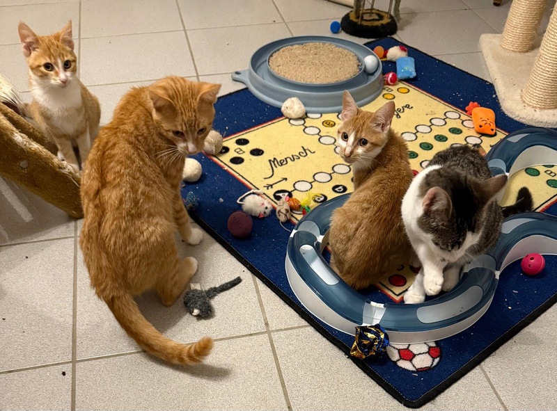 Meister Eder (getigert mit weiß), Pumuckl (rot mit weißen Latz und weißen Pfoten), Anni und Josy (beide rot mit weiß) sind auf der Suche nach einem zu Hause.