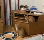 Meister Eder (getigert mit weiß), Pumuckl (rot mit weißen Latz und weißen Pfoten), Schorsch und Toni (beide rot mit weiß) sind auf der Suche nach einem zu Hause.